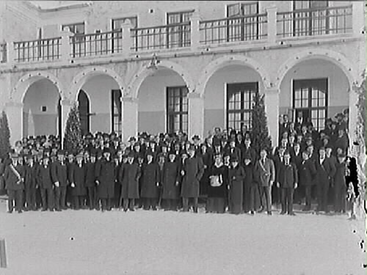 Folksamling framför en arkad på Katrinebergs folkhögskola (troligen). Många personer i bild. De flesta är män. Personerna har ytterkläder på sig och det ligger snö på marken. Mannen längst till vänster i bild har ett band över axel och bröst, som ett ordensband.