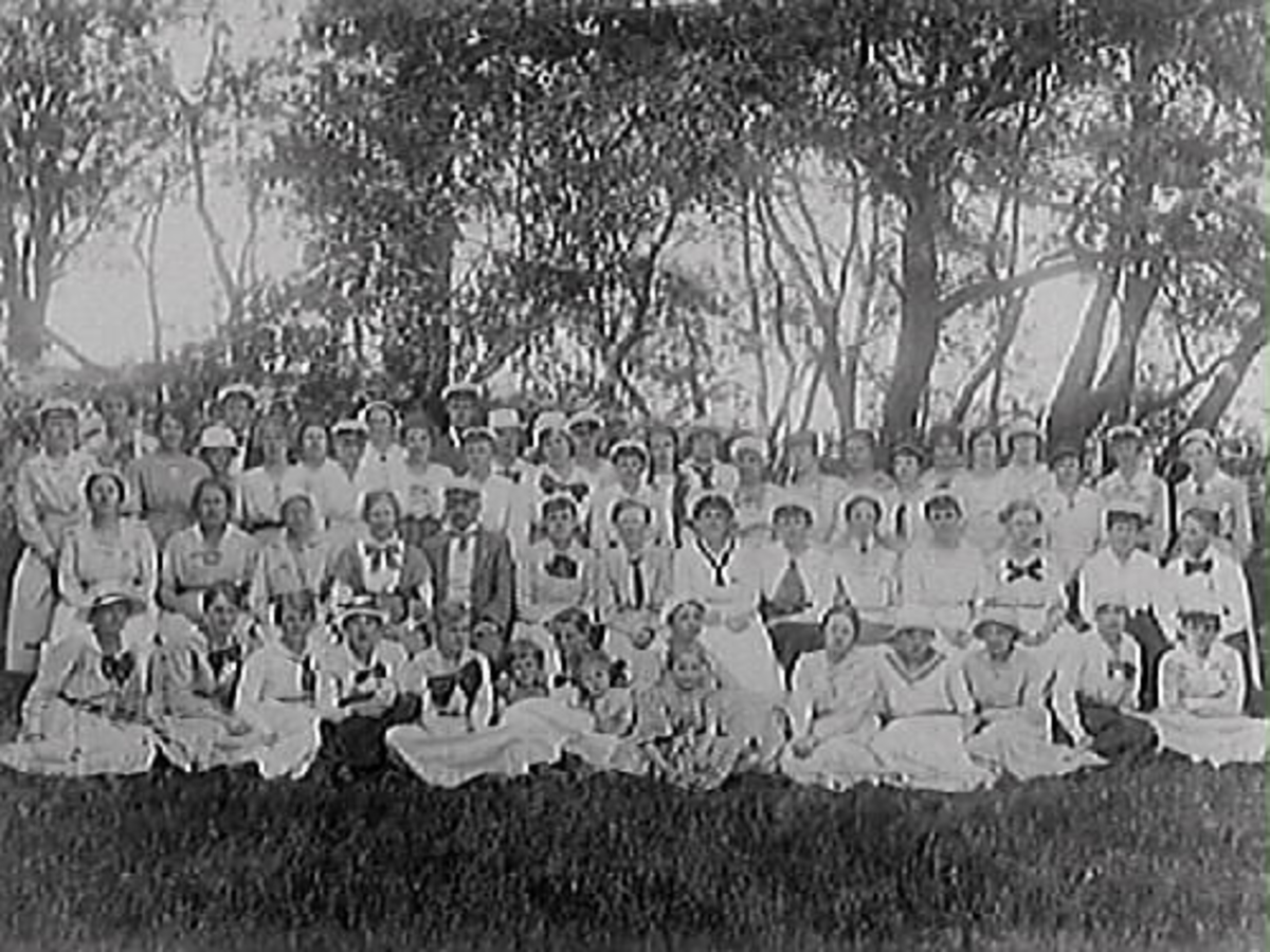 Sommaravslutning. Elever och lärare på Katrinebergs folkhögskola (troligen). Bilden är tagen utomhus). Många personer i bild. De är klädda i ljusa kläder.