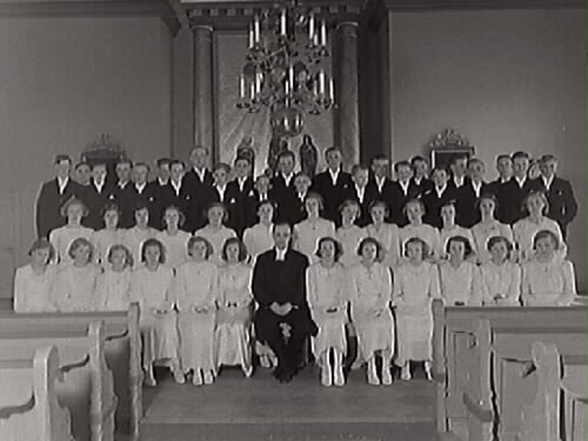 Kyrkoherde Rosén (i mitten) med komfirmandgrupp framför altartavlan i Tvååkers kyrka, år 1939.