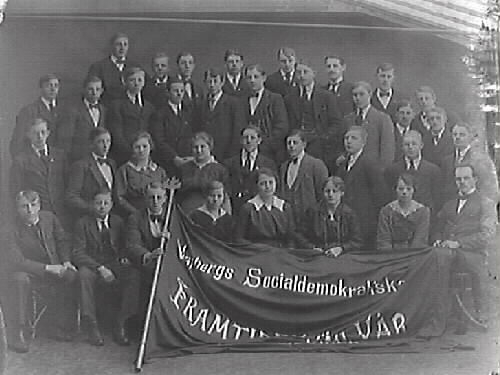 Ateljéfoto av Varbergs socialdemokratiska ungdom, både män och kvinnor. I förgrunden håller de upp sin fana.