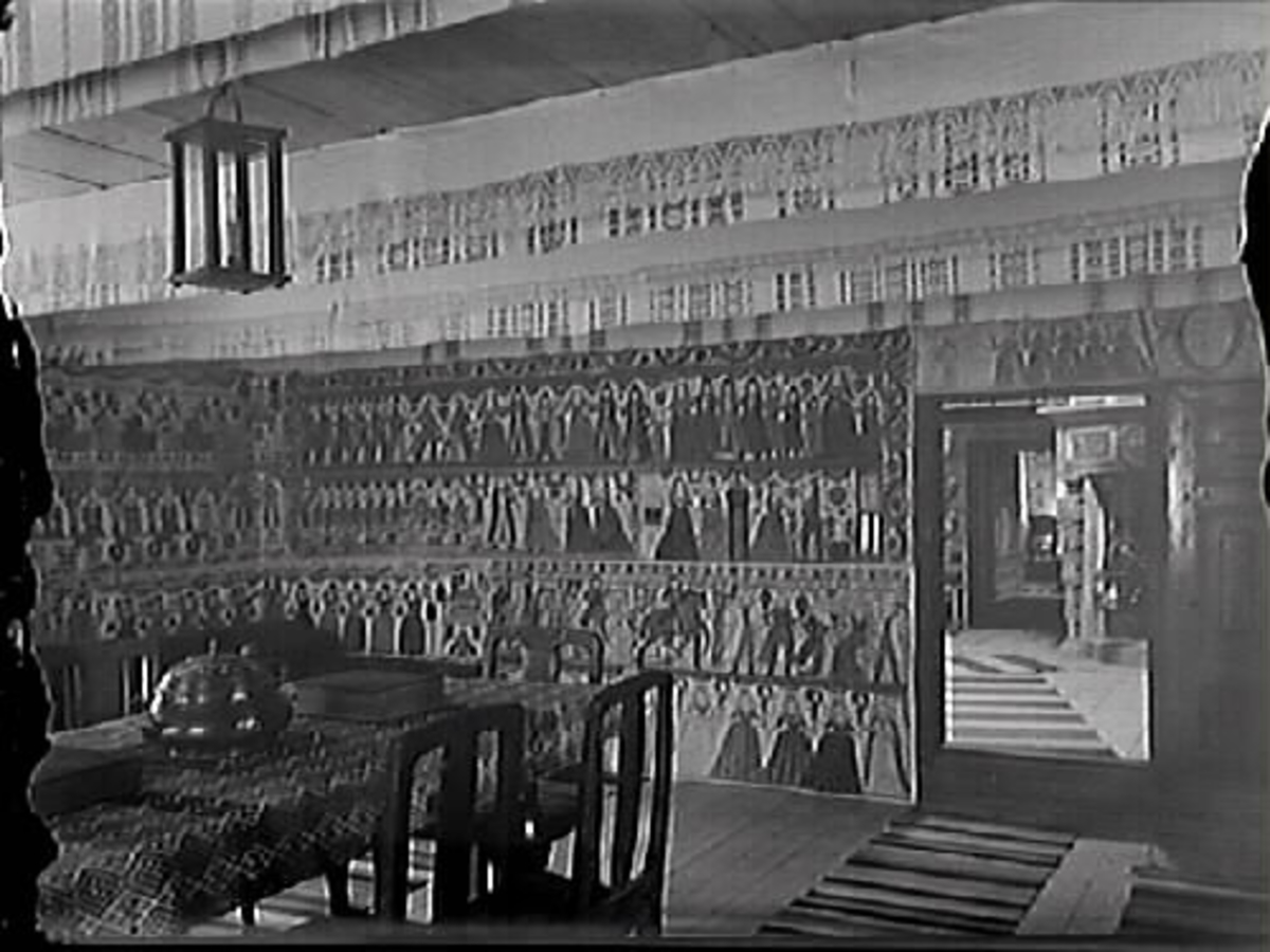 Interiör av bålastugan, Bexellska ryggåsstugan, en dragen stuga, med halländska bonadsmålningar och hängkläden.