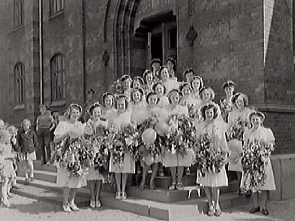 Realexamen. Flickor, och några pojkar, på läroverkets trappa. Eleverna har blivit uppvaktade med blomsterkvastar boch ballonger. De har realskolemössor på sig.