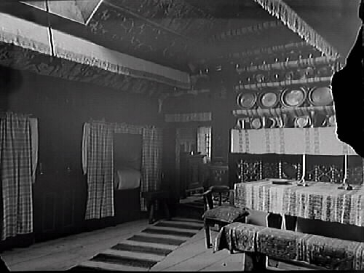 Interiör av bålastugan, Bexellska ryggåsstugan, som är dragen med halländska bonadsmålningar och hängkläden.