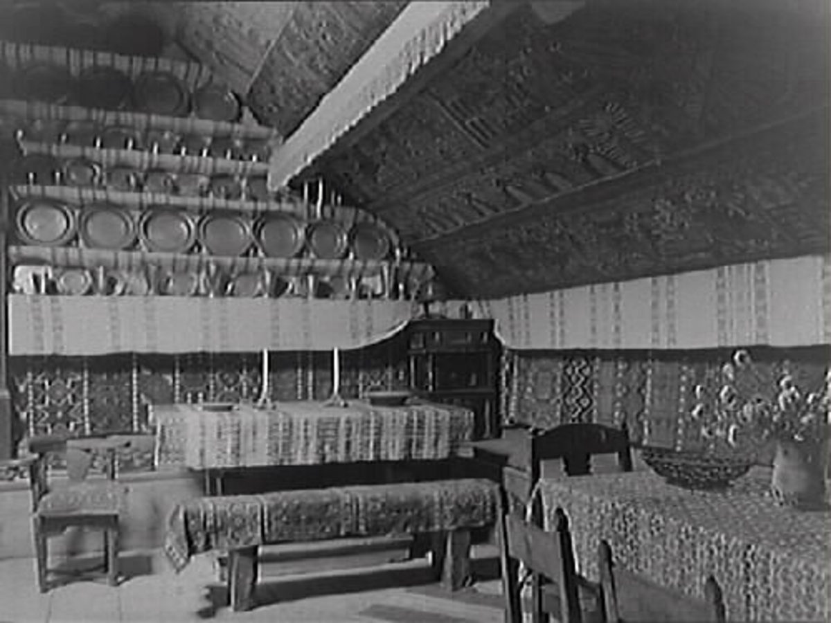 Interiör av bålastugan, Bexellska ryggåsstugan, som är dragen med halländska bonadsmålningar och hängkläden.