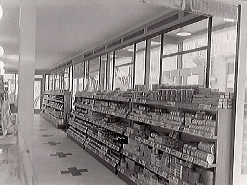Butiken Helge Nilssons speceributik låg i hörnet Borgmästaregatan-Östra Långgatan, Kv Färgaren. Interiörbild av detta nymodiga snabbköp, alltså där kunderna själv plockar varorna istället för att beställa dem av handlaren över disk.