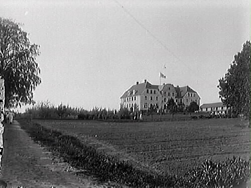 Katrinebergs folkhögskola. Huvudbyggnaden sedd på avstånd med åker i förgrunden.