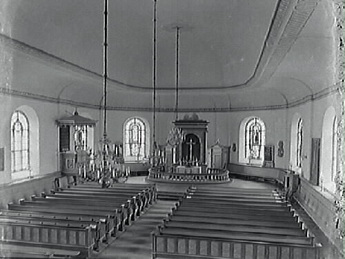 Interiörbild av Varbergs kyrka tagen efter renoveringen 1932, då bl a dekormålningarna målades över och bänkkvarterens utseende förändrades. Vy från läktaren över bänkarna mot koret.