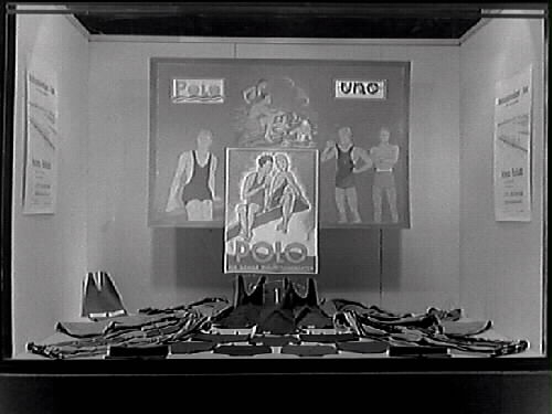 Skyltfönster med reklam för badkläder med märkena Polo och Uno.