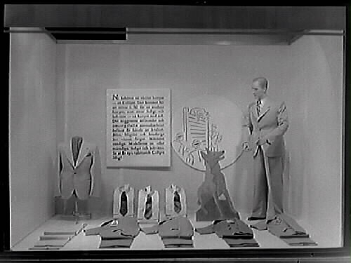 Skyltfönster till en herrekipering. Där står en skyltdocksman i slips och kostym med en hund i koppel. Teckningen intill visar hur en hund tar sig över ett hinder, påhejad av några män. Herrkläder ligger på display under en stor textskylt.