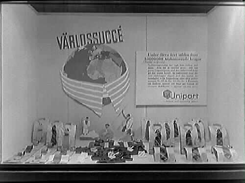 Skyltfönster för en herrekipering. Reklam för slipsar med skyltar där en visar jordgloben omsvept av en krage där "Världssuccé" utropas.
