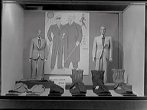 Skyltfönster till en herrekipering. En stor skylt visar en studentklädd yngling i strålande solsken, med en äldre man vid hans sida. Kläder lämpliga för sådana festligheter ligger i fönstret och visas upp av ett par skyltdockor.
