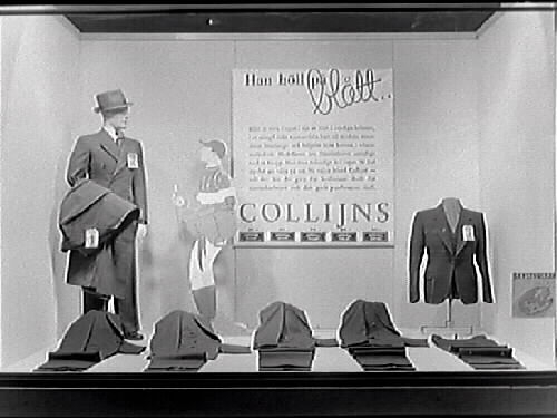 Skyltfönster till en herrekipering. Reklamskylten för Collijns (AB Gunnar Collijn, Stockholm) bär rubriken "Han höll på blått.." Skyltdockan sällskapas av en mindre jockeyklädd pappfigur och förmodligen är de utlagda kostymerna i blå nyanser.