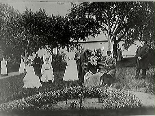 Herrskap och tjänstefolk samlade i en trädgård framför en byggnad i Slöinge.