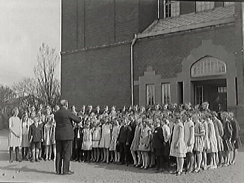 Barnkör sjunger utanför Rosenfredsskolan (Södra folkskolan). En man dirigerar kören.