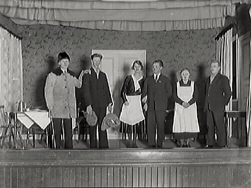Amatörteaterföreställning i Varberg med sex skådelspelare på scenen.