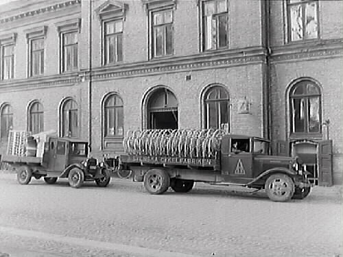 En större lastbil, "Svenska Cykelfabriken" med cykelhjul på flaket, samt en mindre vid Rommelska fastigheten i Varberg. (Svenska Cykeldepoten bytte 1925 namn till Svenska Cykelfabriken, som i sin tur ändrades till Svenska Cykelfabriken Monark år 1934)