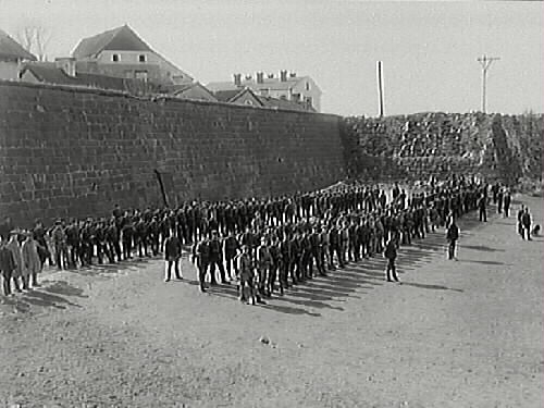 Uppställning av militärer nedanför fästningsmuren åt norr.