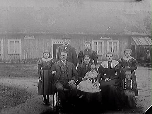 Familj i flera generationer samlade ute på gårdsplanen till ett långsträckt bostadshus. Dörren har spröjsat överljus och vid takfoten sitter två dito lunettfönster.