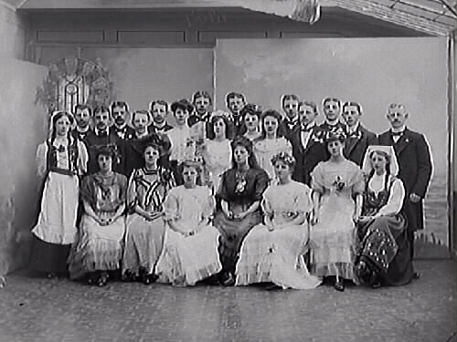 Troligen från en bal eller liknande fest. Stående från vänster: Lisa Ohlsson, Holger Thoulander, Sven Sandström, John Johansson, Ivar Johansson, Einar Bergstrand, Anna Johansson, Axel Hugo Ekdahl, "Lilla" Anna Svensson, Charles Kristensson, Evy Erlandsson, Annie Lindqvist, Floridan Johansson, Reinhold Bengtsson, sympaten Sandberg till Wetterlund, Calle Magnusson.Sittande från vänster: Gerda Nicklasson, Hilda Andersson, Helena Johansson, Elin Svensson, Hedy Johansson, Torborg Jacobsson, Cecilia Jacobsson. Troligen en dansföreställning av något slag.