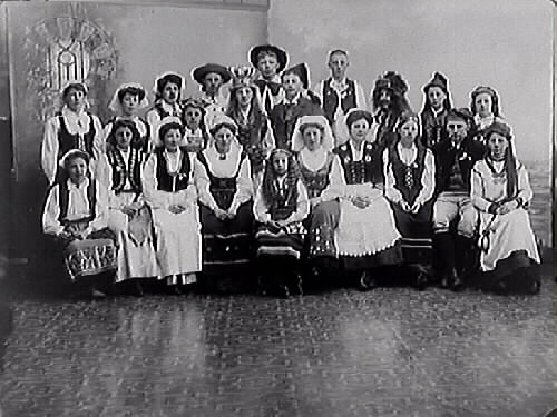 En grupp människor framför kulisser i folkdräktsliknande klädsel. I mitten står ett förmodat brudpar då kvinnan bär en stor (brud)krona. Kanske ett teatersällskap.