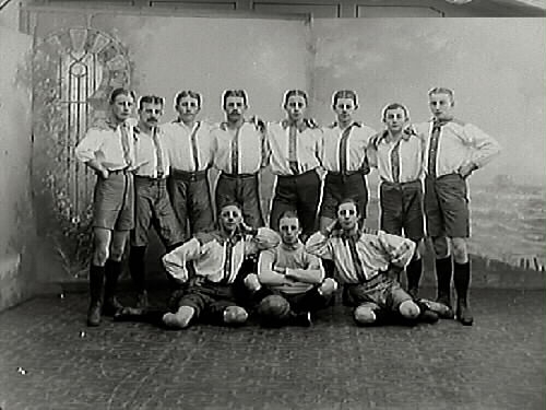 Ateljébild av en grupp unga män i likadana kläder och mittbenor. Troligen någon sorts förening.