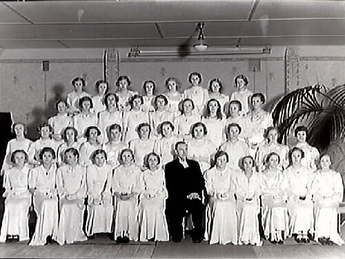 Konfirmation. Prästen Ernst Sjöblom i mitten. Sittande från vänster: Märta Andersson, Kerstin Pettersson, Inga Olofsson, Anna-Greta Paulsson, Anna-Lisa Bengtsson, Brita Karlsson, Ingvor Fritsman, Ulla Andersson, Inga-Lill Johansson, Anna-Lisa Söderblom, Ingrid Svensson. 2:a raden: Kerstin Larsenius, Margit Olsson, ?, Margit Johansson, Ulla Andersson, Maj-Britt Svensson, Anna-Lisa Berg, Ingrid Persson, Herdis Abrahamsson, Rut Andersson, Gunnel. 3:e raden: Stellan Andersson, ?, ?, Agnes, Mildred Johansson, Ingrid Appelgren, ? , Anna Vera Johansson, Maj Bengtsson. Översta raden: Gunborg Agner, Maj Hedberg, ?, Anna-Lisa Kaspersson, Gurli Johansson, Stella Malmström, Märta Johansson, ?,.