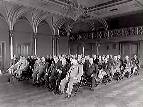 Fastighetsägarnas kongress i Varberg 1937. Från höger räknat, 2:a radens första man: Redaktör Henriksson; 4:e Brink; 6:e Sandell.