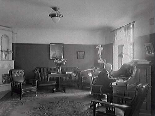 Interiör av salongen i bostaden på andra våning av Apoteket Kronan i huset vid hörnet Torggatan-Drottninggatan, Varberg. Apotekare Hultkvist sitter vid sin sekretär. Kv Apotekaren 8.