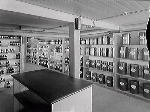 Apoteket Kronans lagerkällare för salvor, kemikalier, råvaror, halvfabrikat mm som är prydligt uppställt på hyllorna. Det var av yttersta vikt att man hade en noggrann och enhetlig uppmärkning på burkarna. De var ofta gjorda i bleckplåt, eller stengods om kärlen var större, för att inte råttor eller möss skulle kunna gnaga sig in. Apoteket låg vid hörnet Torggatan-Drottninggatan, kv Apotekaren 8.