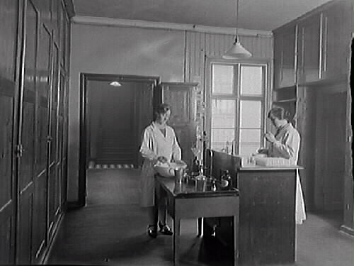 Apoteket Kronans tinkturkammare där medicin tillreddes. Annie Andersson och Sigrid Svensson, Varberg demonstrerar arbetet. Kv Apotekaren 8.