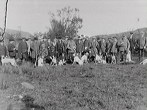 Stort sällskap män med hundar, troligen jaktsällskap i trädfattig kustmiljö.