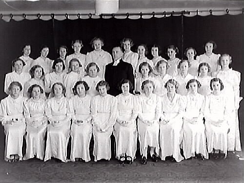 Konfirmander med prästen Sjöblom i mitten. Från vänster sittande: Inga-Britt Bengtsson, Maj Karlsson, Anna-Greta Eliasson, Stina Albrektsson, ?, Ulla Börjesson, ?, Göta Nilsson, Ann-Marie Karlsson, Ingrid Olausson. 2:a raden: ?, Stina Andersson, Anna Nilsson, Martha Pehrsson, ?,Brita Blom, Maj-Britt Bensson, ?, ?, ?, Solveig Broberg. 3:e raden: Inga-Lill Nilsson, Birgit Törnblad, Ellen Johansson, Anna-Lisa Andersson, Solveig Apelqvist, ?, ?, Britt Johansson, Rut Gustafsson, Maj-Britt Eklund, Helena Johansson, Anna-Greta Johansson, Gunnel Pettersson, Inga Bengtsson.