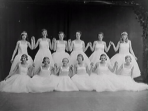 Bilden tagen vid avslutningen av en danskurs på Varbergs hotell. Förutom balett lärde man sig tango, foxtrot och vals. Flickorna är mellan 12-15 år och går alla på Flickskolan. Stående från vänster: Harriet Ekström, Kersti Hylmö, Greta Johansson, Gunvor Karlsson, Silva Vegnér, Kerstin Svensson från Långås (?). Sittande: Anna Stålbrand, Ingeborg Olsson från Lisbro i Långås, Lena Uddenberg, Anna-Greta Svensson, Inga-Greta Lindblom, Gunvor Förstberg (?).