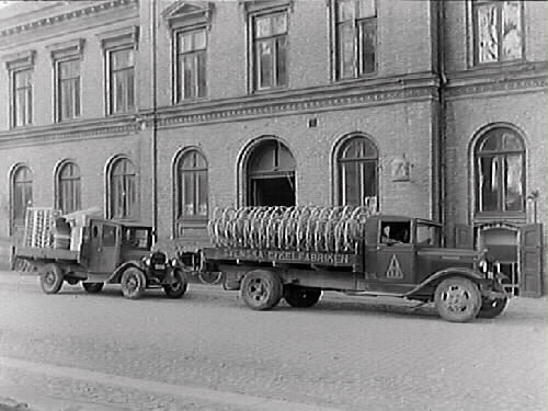 En större lastbil, "Svenska Cykelfabriken", med cykelhjul på flaket samt en mindre vid Rommelska fastigheten i Varberg. (Svenska Cykeldepoten bytte 1925 namn till Svenska Cykelfabriken, som i sin tur ändrades till Svenska Cykelfabriken Monark år 1934)