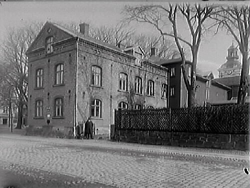 Jobsons magasin, kv Brunnsparken, Varberg. Byggnaden ligger med gaveln mot Västra Vallgatan och Brunnsparken utmed norra långsidan. Till höger syns kyrktornet.