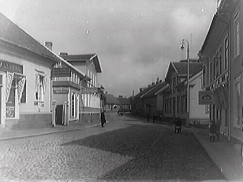 Gatuparti i Falkenberg. Kullerstensgata. Till höger en bageriskylt.