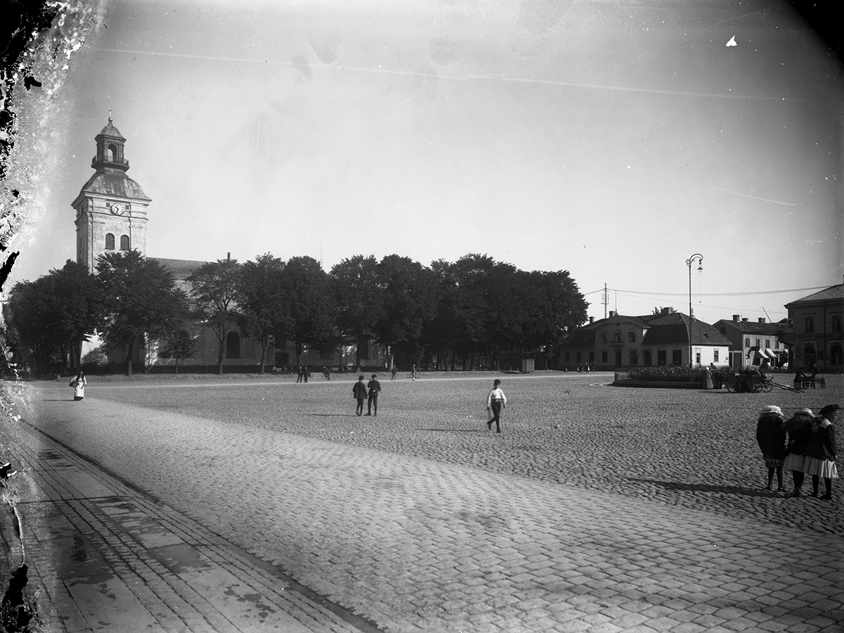 Varbergs torg sett från Kungsgatan mot kyrkan och till höger den så kallade brännvinsringen från 1880-talet. På dess stensatta sockel satt torgmadamerna och sålde sina varor. Till höger står tre små flickor och fler personer rör sig på torget. I hörnbyggnaden till höger om kyrkan låg det gamla apoteket.