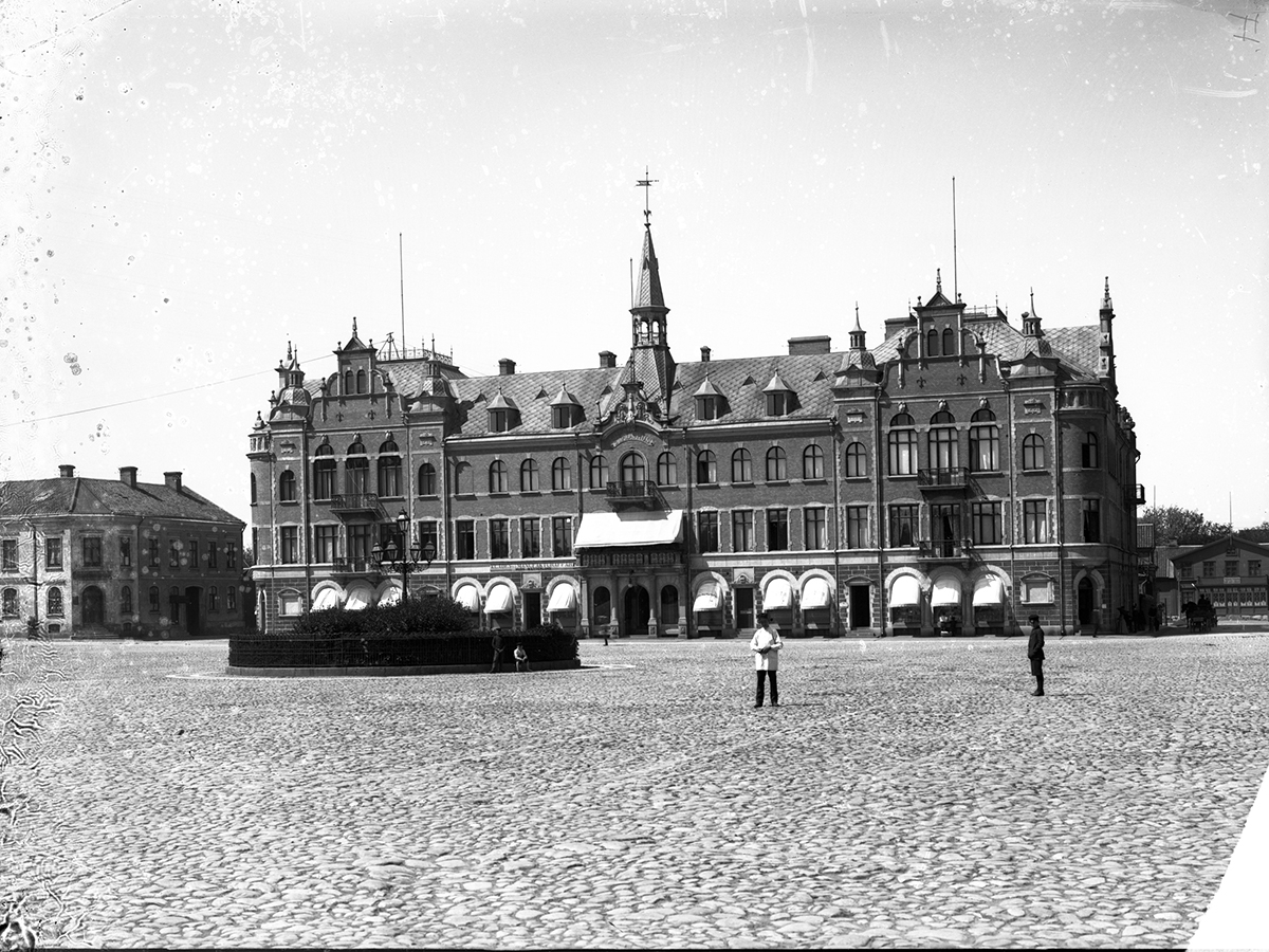 Varbergs kullerstensatta torg med en rund plantering, kallad Brännvinsringen, och dåvarande stadshuset och -hotellet. Det invigdes 1902 och hade då även affärer i bottenvåningen. Stadsförvaltningen lämnade byggnaden 1954. Till vänster ses kv Gästgivaren.