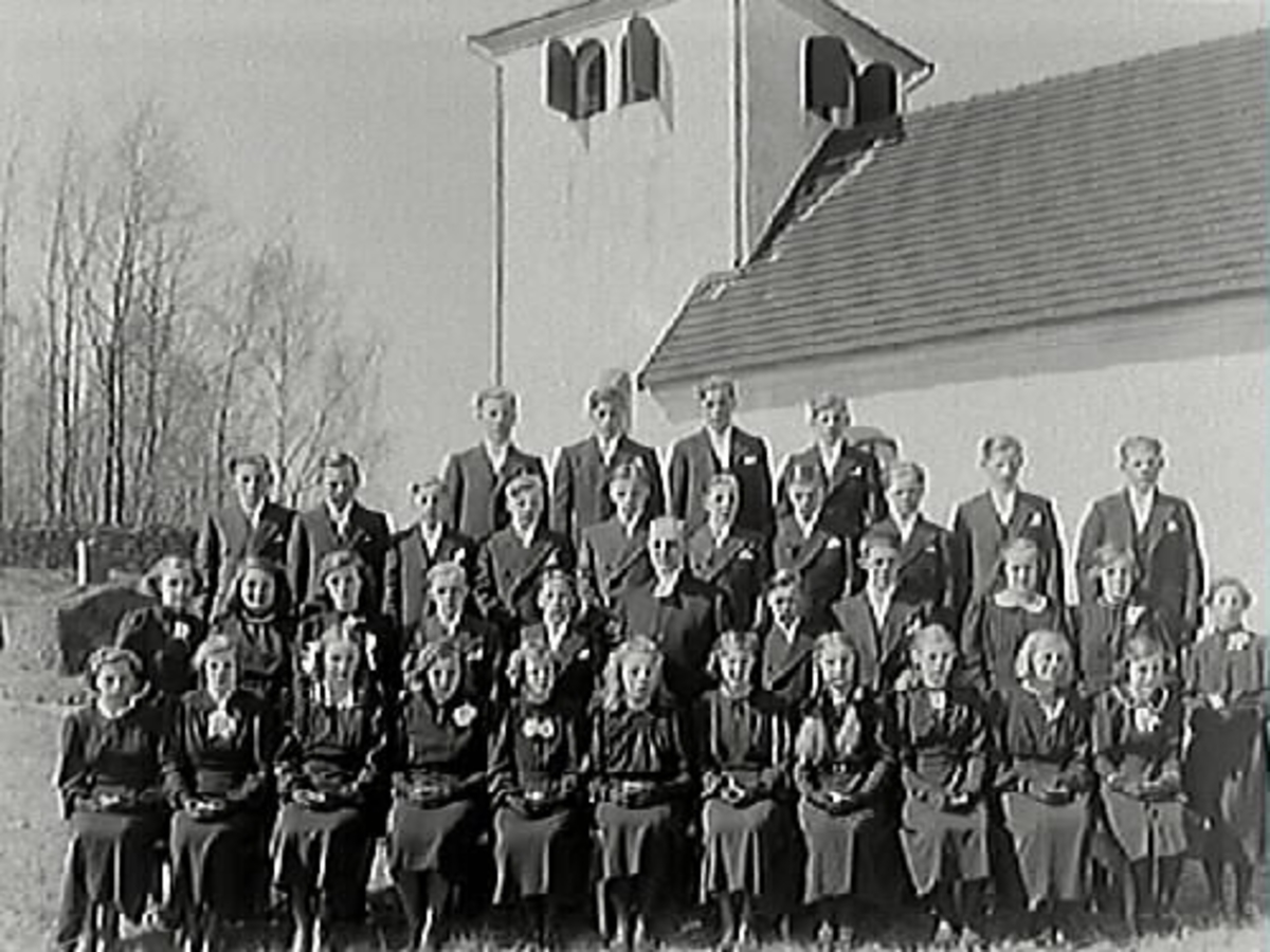 Prästen Ljugnér (i mitten) med konfirmander framför Rolfstorp kyrka.