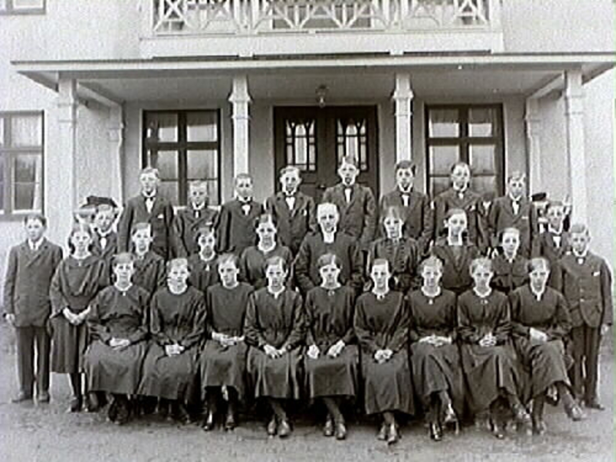 Istorp, prästen Levén (i mitten) med komfirmander. Bilden är tagen framför entrén till en byggnad.