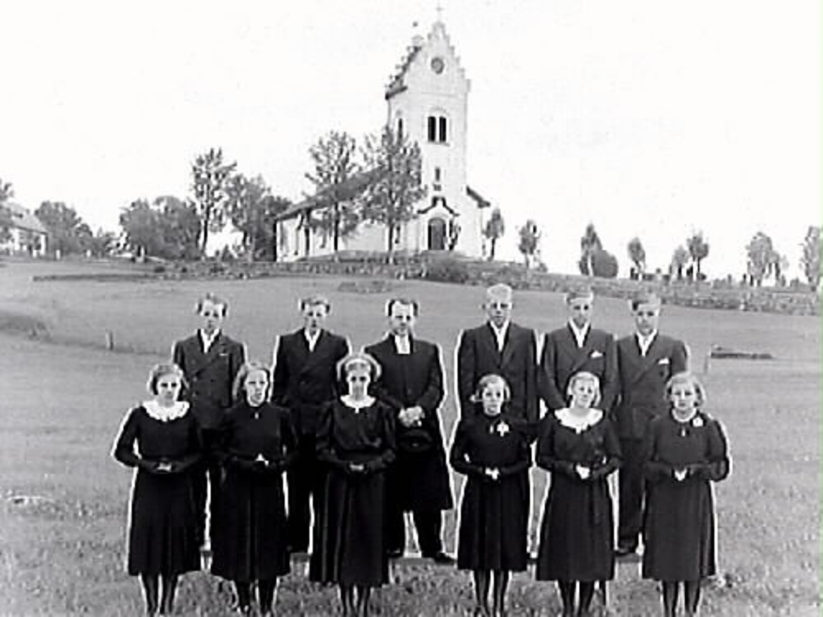 Prästen Hagman (i mitten) med konfirmander. I bakgrunden Öxabäck kyrka.