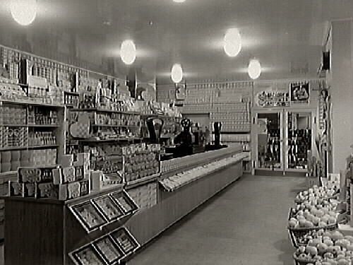 Interiör från Kooperativa föreningens butik med välfyllda diskar och hyllor. Till höger i bild syns korgar med frukt.