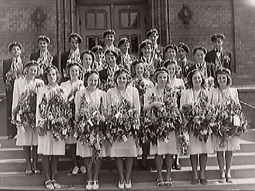 1:a raden från vänster: Gunnel Larsson från Morup, Anna-Greta Oscarsson från Veddige, Anna-Lisa Johansson från Veddige, Barbro Johansson, Margareta Berglind, Anna Rappe. 2:a raden: Sonja Svensson från Tvååker, Maria Strandvik från Tvååker, Birgit Norin, Margareta Persson. Pojkar från vänster: Gerhard Wetterquist från Valinge, Torsten Liljegren, Jonas Strandvik från Träslövsläge, Ingvar Olsson, Bertil Samuelsson, Ingvar Svensson från Grimeton, Manne Helander från Träslöv, Gösta Andersson från Tvååker, Folke Karlsson från Istorp, Gunnar Blom, John Eliasson från Derome, Lennart Källström, Nils Svanberg, Ivar Larsson från Tvååker.