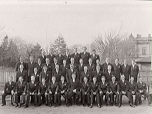 Konfirmation. Församlingshemmet, Västra vallgatan, Varberg. Prästen Tore Sjöblom sitter i mitten. Från vänster, sittande: Göte Mårtensson, Ture Isaksson, Bertil Svensson, Sven Bossmark, Gunnar Lindeberg, Bo Hallberg, Ingvar Hellman, Gunnar Friberg, Göran Strömkvist, Helge Karlsson 'Dragos', Ingvar Andersson, Bengt Christensson, Hans Berntsson. 2:a raden: Ingvar Pettersson, Verner Olsson, Erland Nilsson, Stig Henriksson, Arne Antonsson, ?, Stig Davidsson, Karl Olof Weddig. 3:e raden: Rune Andersson, Gunnar Robertsson, Sven Erik Halldén, Gösta Bengtsson, Karl Gunnar Strandberg, Levin Eriksson, Folke Blom, Kurt Helander, Sven Ekfeldt, ?, Gösta Andersson, Roland Bengtsson, Bertil Johansson, Tage Larsson. 4:e raden: Erling Andersson, Alf Andersson, Stig 'Kia', Kurt Pettersson, Roy Nicklasson, Evert Rickardsson, Olle Bergman."