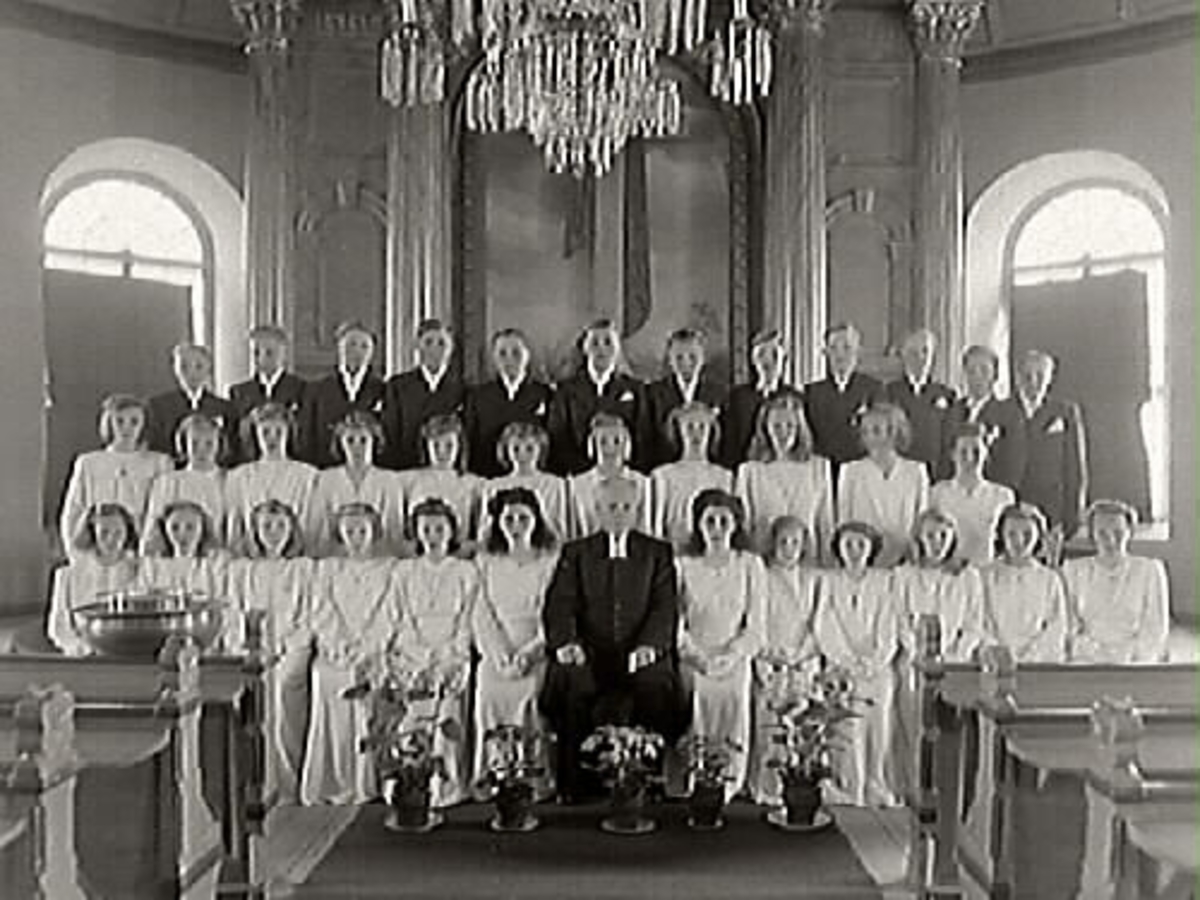 Prästen Glemme (i mitten) med komfirmander i koret i Värö kyrka 1945. .