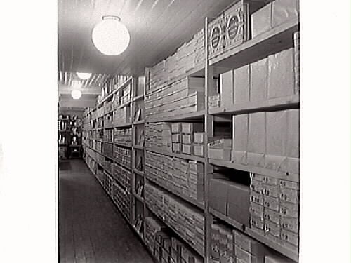 Butiken Helge Nilssons speceributik med självbetjäning låg vid hörnet Borgmästaregatan-Östra Långgatan, Kv Färgaren. Bilden visar interiörbild från lagret.
