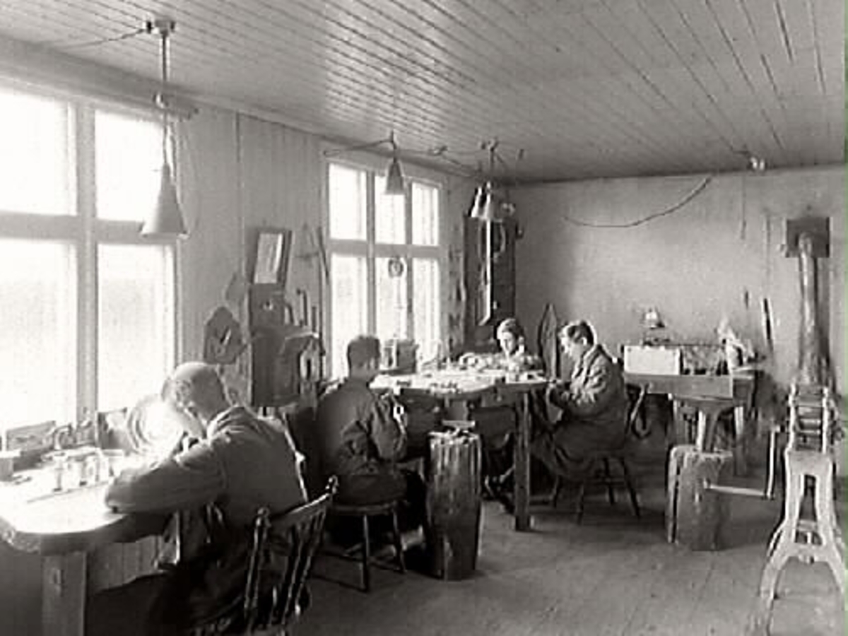 Guldsmeder i guldsmed John Viktorins verkstad, bakom butiken vid hörnet Norrgatan-Kungsgatan, kvarteret Berget, Varberg.