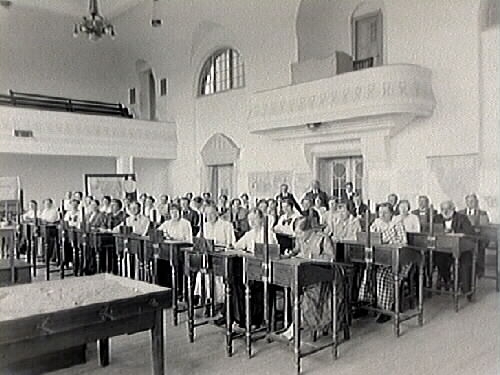 Hembygdskurs i Rosenfredsskolans aula, Varberg. Kursdeltagarna sitter i skolbänkar och utgörs av både män och kvinnor.