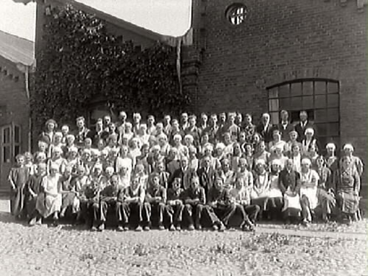 Arbetare vid Malmö Yllefabrik framför fabriksbyggnaden. Majoriteten av arbetarna på bilden är kvinnor.