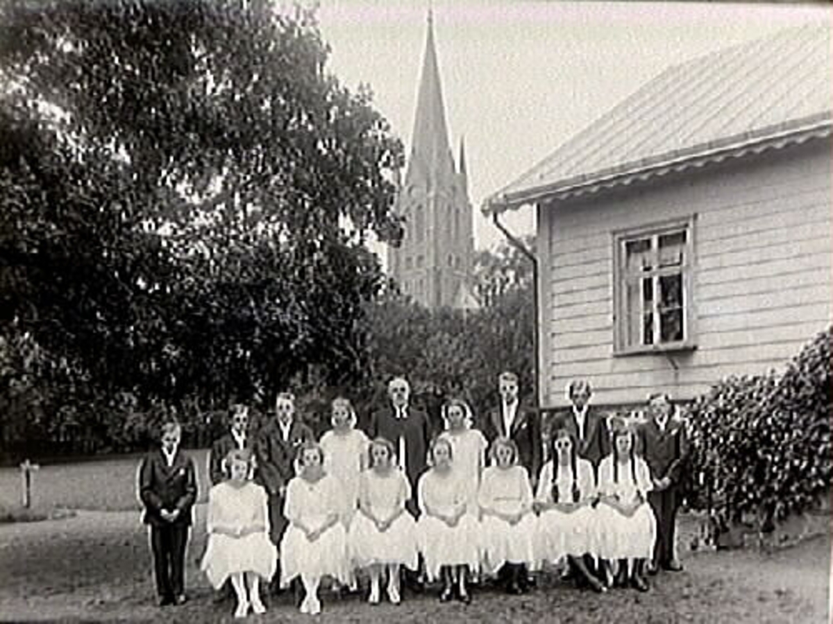En grupp komfirmander och präst i trädgården på Årstad prästgård. I bakgrunden syns kyrkan.